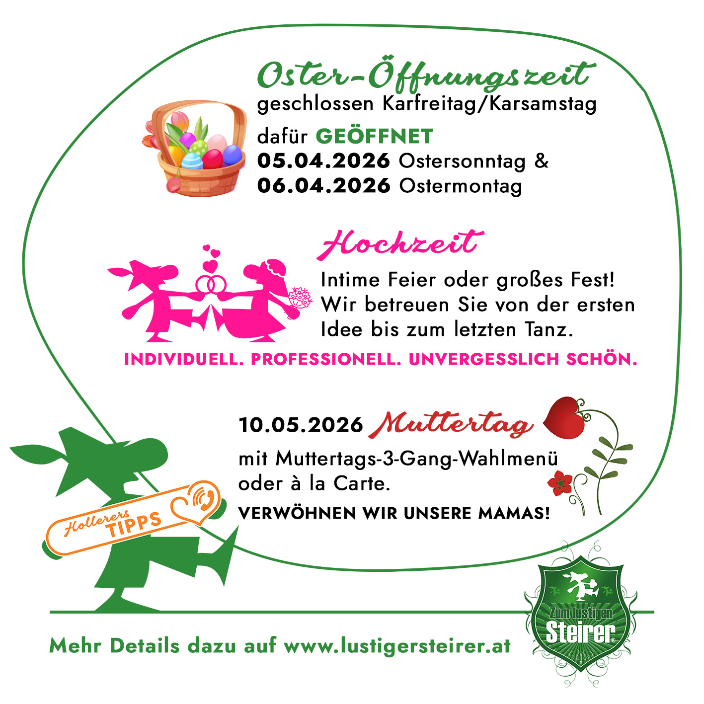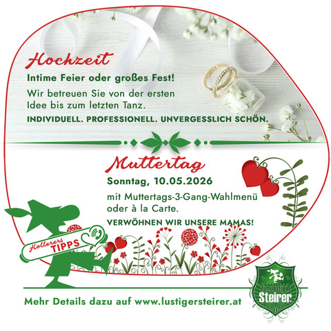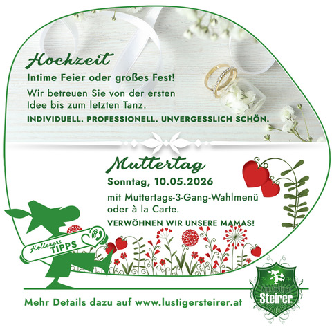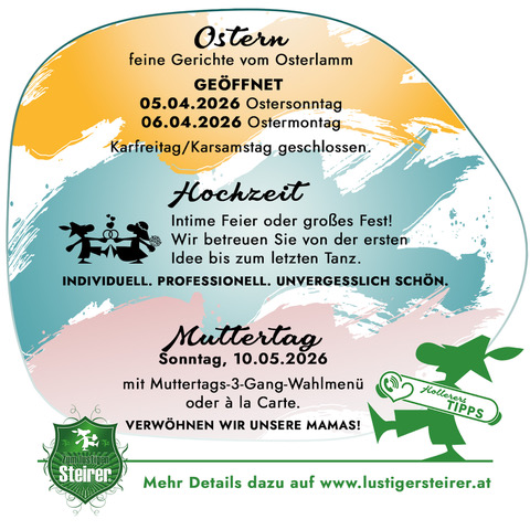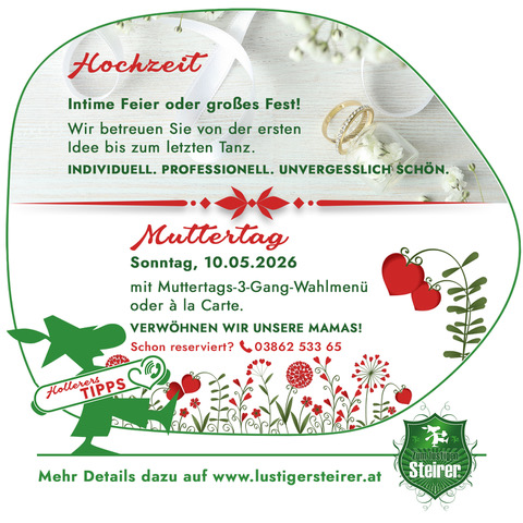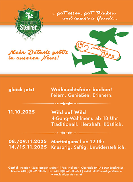 Abbiegen von den eingefahrenen Wegen des Alltags und ankommen in der zauberhaften Welt von Oberaich – nichts einfacher als das. Zwischen Bruck an der Mur und Leoben, inmitten einer Naturlandschaft von einsamer Schönheit, verbinden wir im „Zum lustigen Steirer“ Tradition und die Leidenschaft auf Neues. Erleben Sie den Komfort unserer Pension und unserer Zimmer. Erholen Sie sich im gemütlichen Ambiente von den Mühen des Tages oder nutzen Sie unser Haus als Ausgangspunkt für Wanderungen, Ausflüge und sportliche Aktivitäten. Lassen Sie sich von uns während Ihres Aufenthaltes rundum umsorgen und fühlen Sie sich einfach wohl.