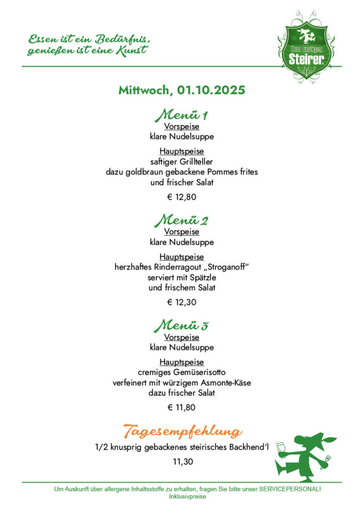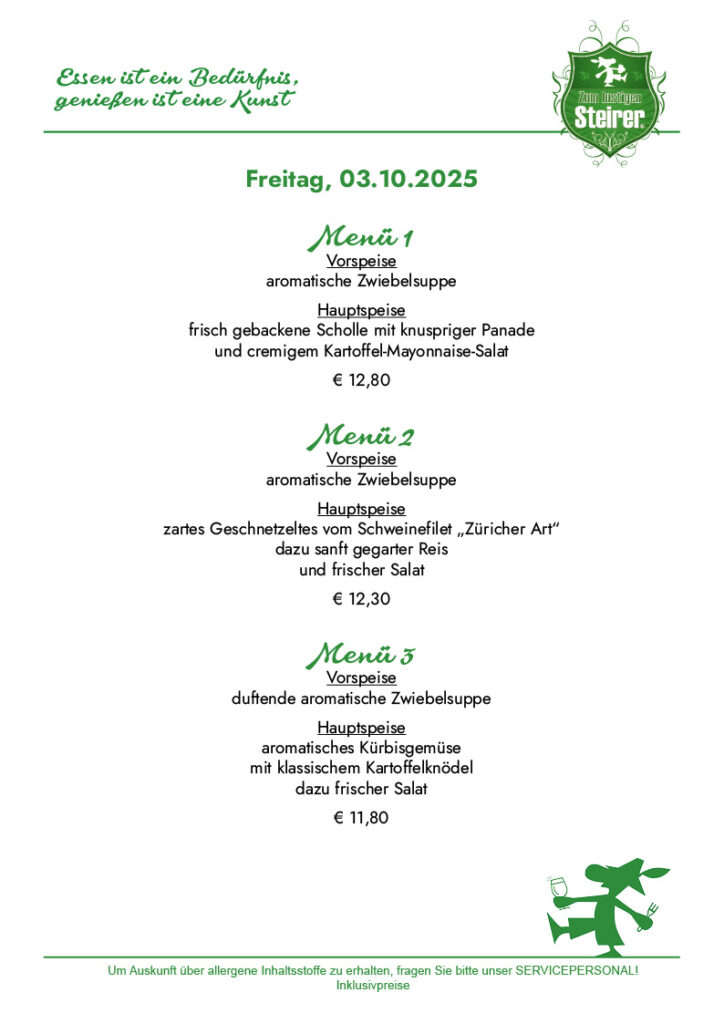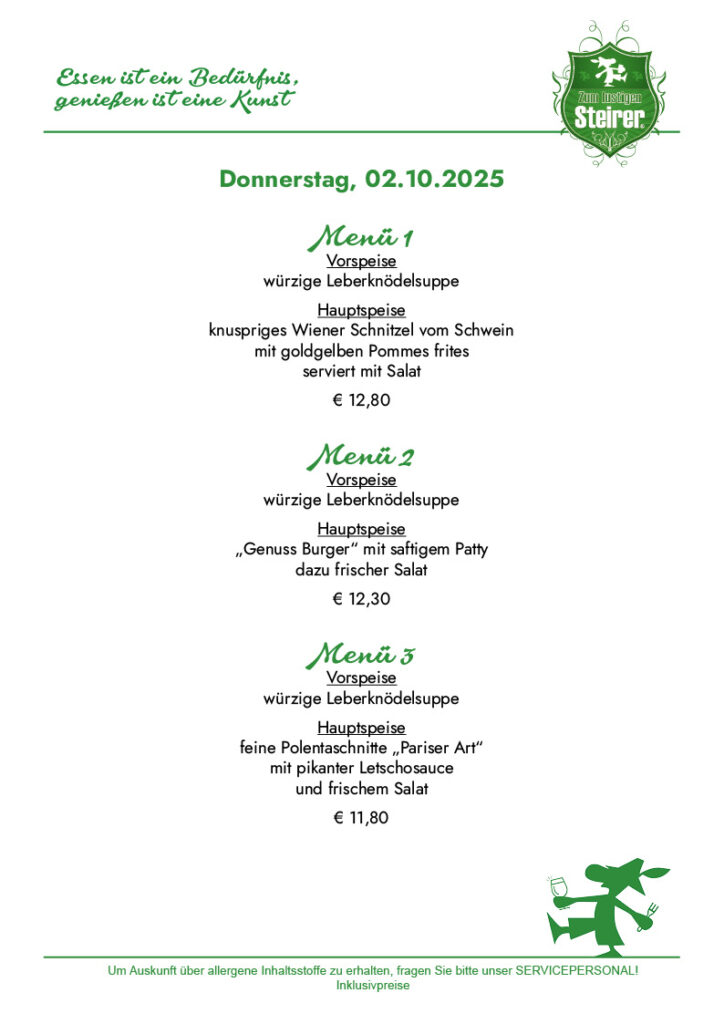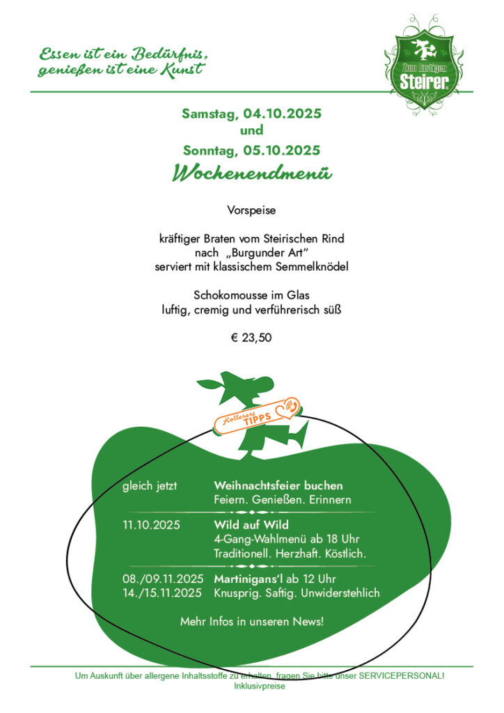 Startseite News Speisen Wochenmenü Speisekarte Galerie Events Location Pension Gasthaus Cafe Weinkeller Feststadl Erholungspark Gourmetstüberl Grillhütte Zimmerpreise Kontakt X Wochenmenü Gasthaus – Pension„Zum lustigen Steirer“Familie HollererOberaich 19A-8600 Bruck an der Mur Tel: +43 (0) 03862 533650info@pn-lustigersteirer.atgh-lustigersteirer@aon.at Datenschutz / AGB Impressum Privatsphäre-Einstellungen ändern