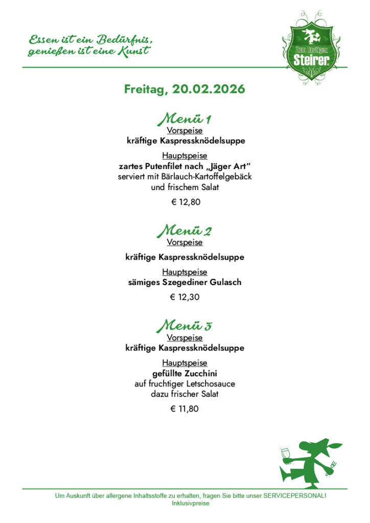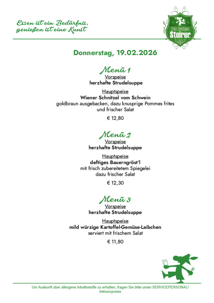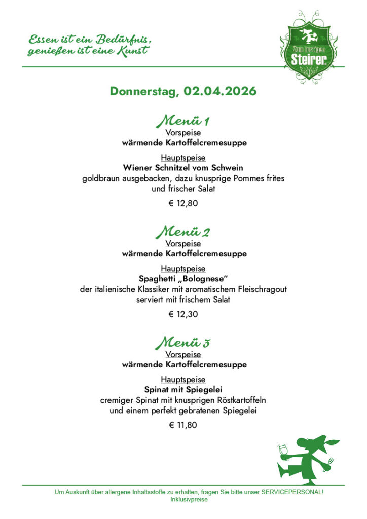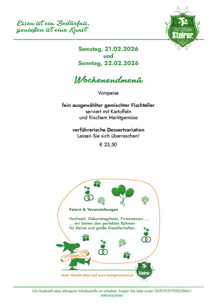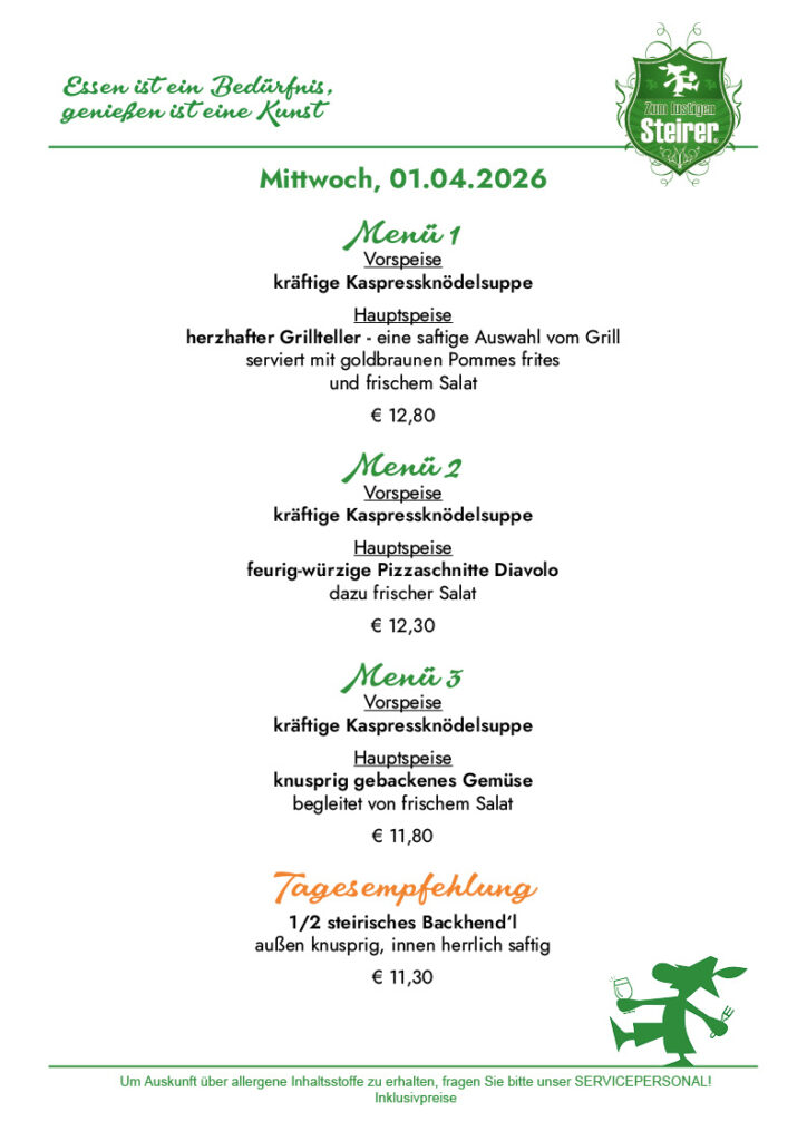 Startseite News Speisen Wochenmenü Speisekarte Galerie Events Location Pension Gasthaus Cafe Weinkeller Feststadl Erholungspark Gourmetstüberl Grillhütte Zimmerpreise Kontakt X Wochenmenü Gasthaus – Pension„Zum lustigen Steirer“Familie HollererOberaich 19A-8600 Bruck an der Mur Tel: +43 (0) 03862 533650info@pn-lustigersteirer.atgh-lustigersteirer@aon.at