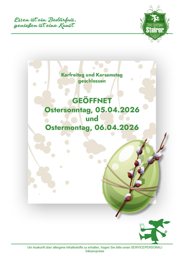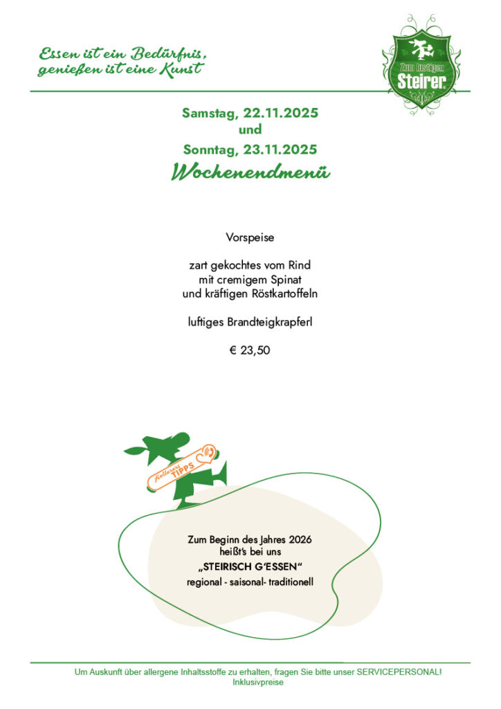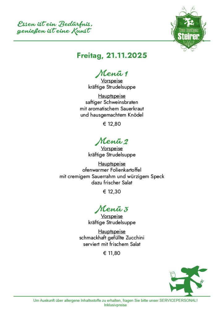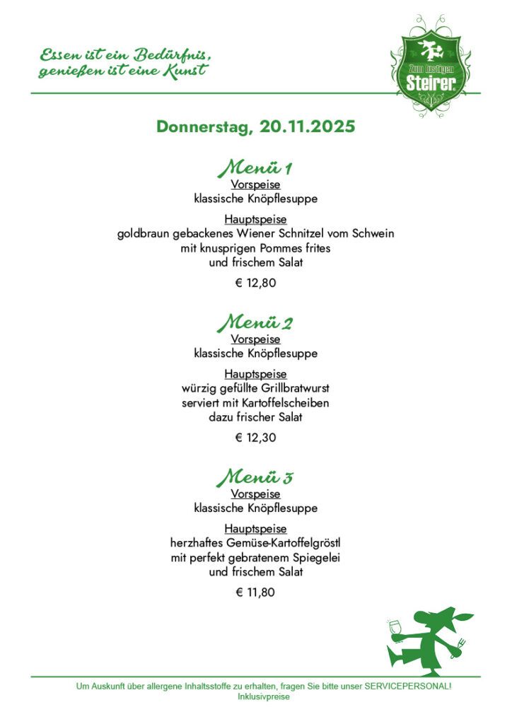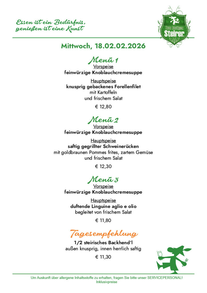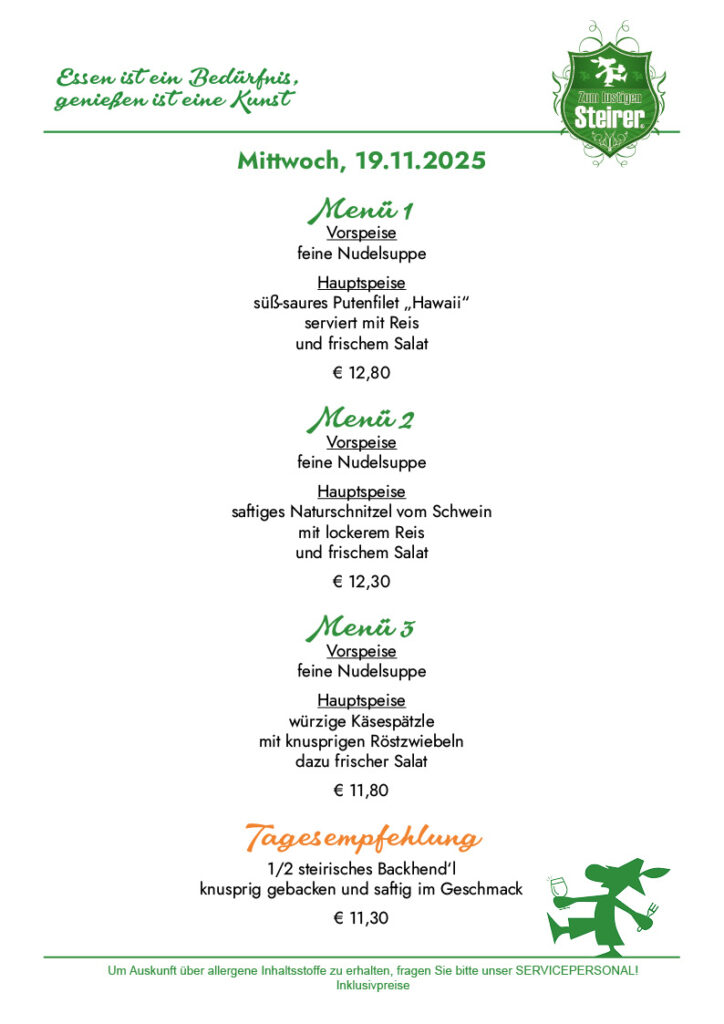 Startseite News Speisen Wochenmenü Speisekarte Galerie Events Location Pension Gasthaus Cafe Weinkeller Feststadl Erholungspark Gourmetstüberl Grillhütte Zimmerpreise Kontakt X Wochenmenü Gasthaus – Pension„Zum lustigen Steirer“Familie HollererOberaich 19A-8600 Bruck an der Mur Tel: +43 (0) 03862 533650info@pn-lustigersteirer.atgh-lustigersteirer@aon.at